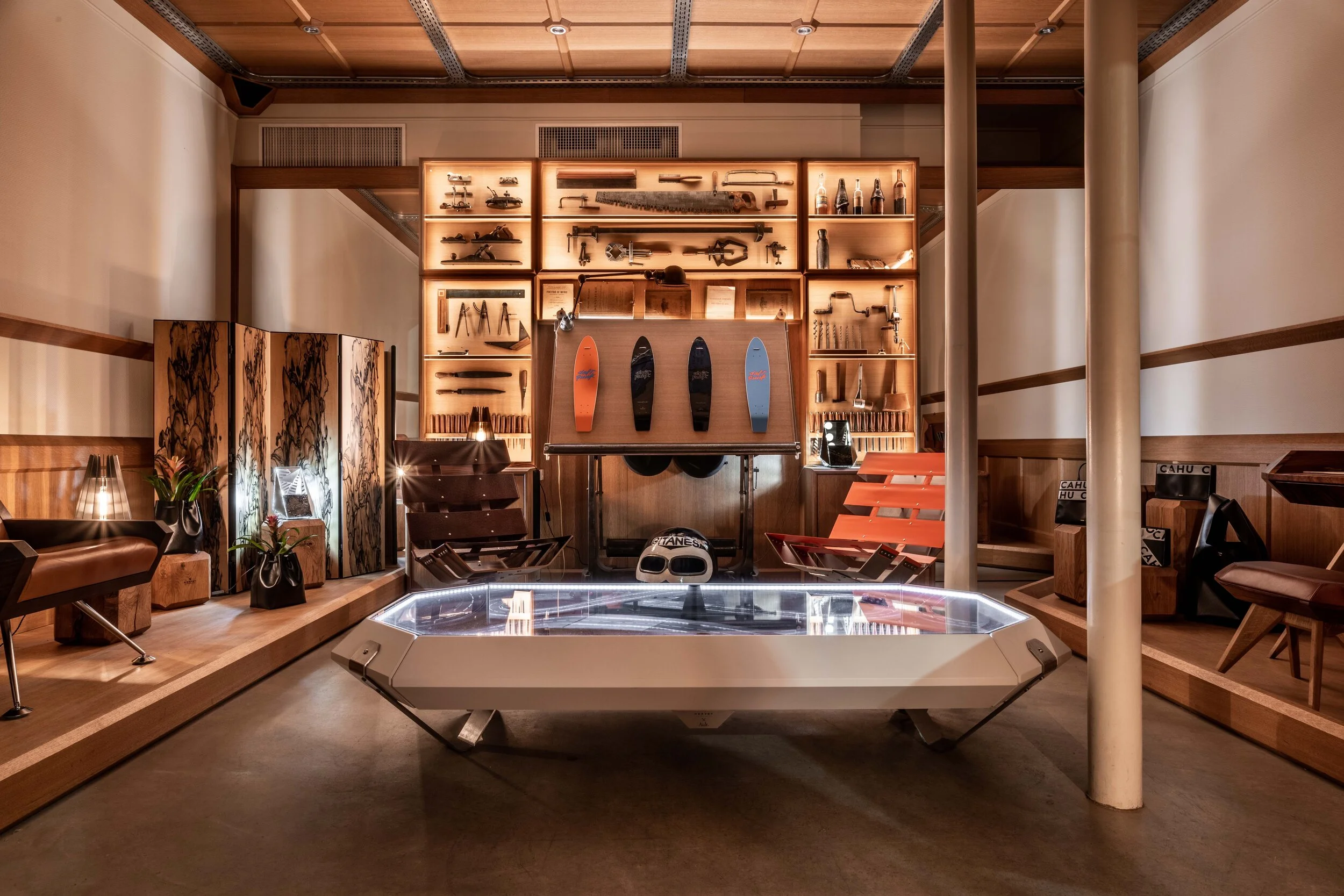 Conçue avec Hervet Manufacturier, cette table d'ébénisterie en bois laqué et inox brossé dissimule un authentique Circuit 24 derrière un miroir sans tain.